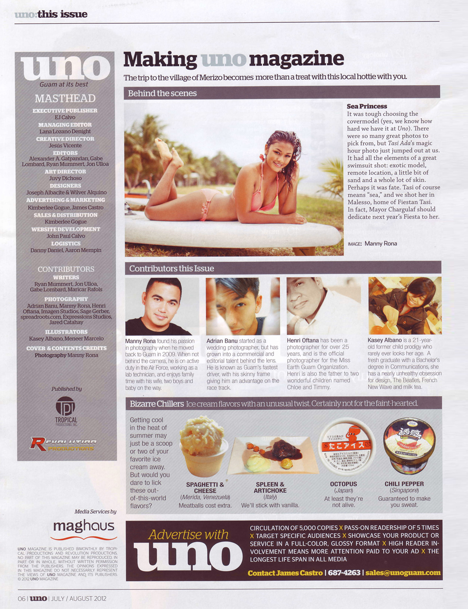 I’m humbled and honored to be included as one of the photographers – lucky enough to take photos of Guam’s beautiful women in sizzling swimsuits. Even more blessed when I found out that my photo of Tasi Ada was chosen as the cover for UNO Guam’s 2012 Swimsuit Edition.